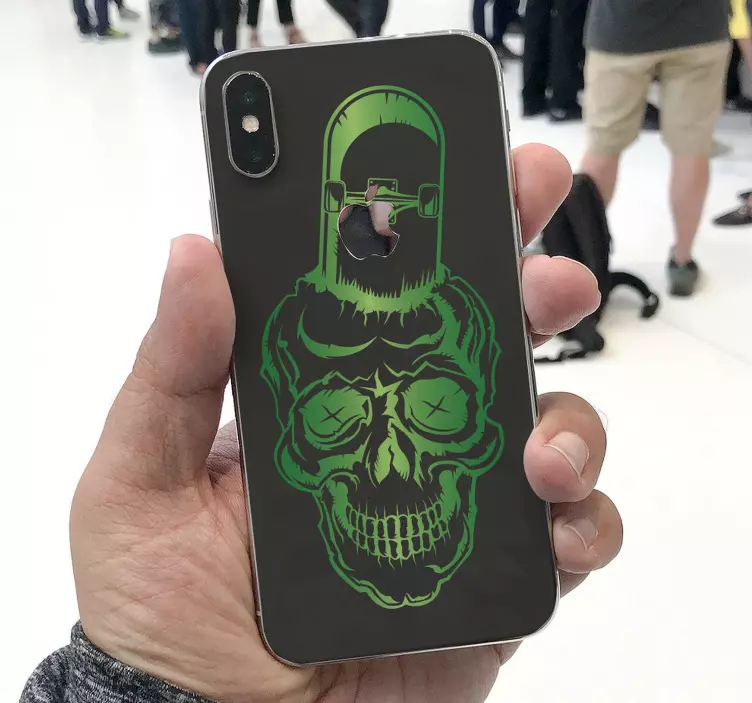 Introducing the Iphone sticker green skull design, a striking visual that features a vibrant green skull character, perfectly suited for adding a unique flair to your phone or skateboard. This design stands out with its edgy aesthetic and lively character, making it a must-have for anyone looking to express their individuality!