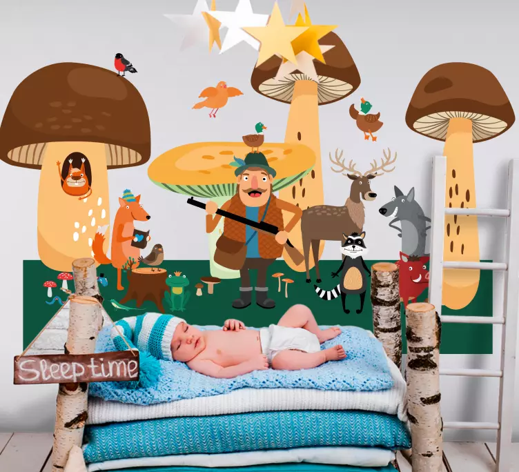Reference: A49201A delightful scene featuring a variety of playful animals in a forest setting. This includes whimsical mushrooms and a cheerful character engaging with the wildlife. Perfect for creating a magical atmosphere in children's spaces, encouraging imagination and love for nature.