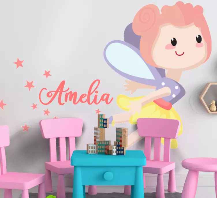 Reference: A48618A playful character design featuring a whimsical fairy with colorful wings and a cheerful expression. The customisable aspect adds a personal touch, making it ideal for a child's space. Delicate stars accompany the character to enhance its enchanting appeal.