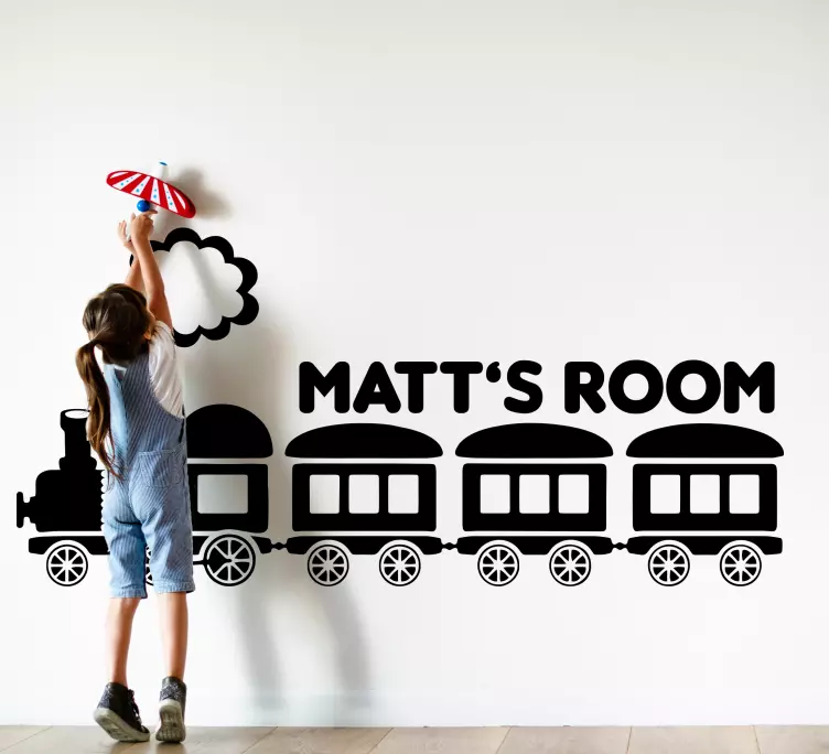Introducing our delightful Kid's sticker with train themed personalization, a charming addition to any children's room! This unique design features playful train silhouettes, allowing you to customize it with your child's name. The black and white color scheme brings a modern touch, making it a perfect fit for any décor while adding a whimsical element to the space.