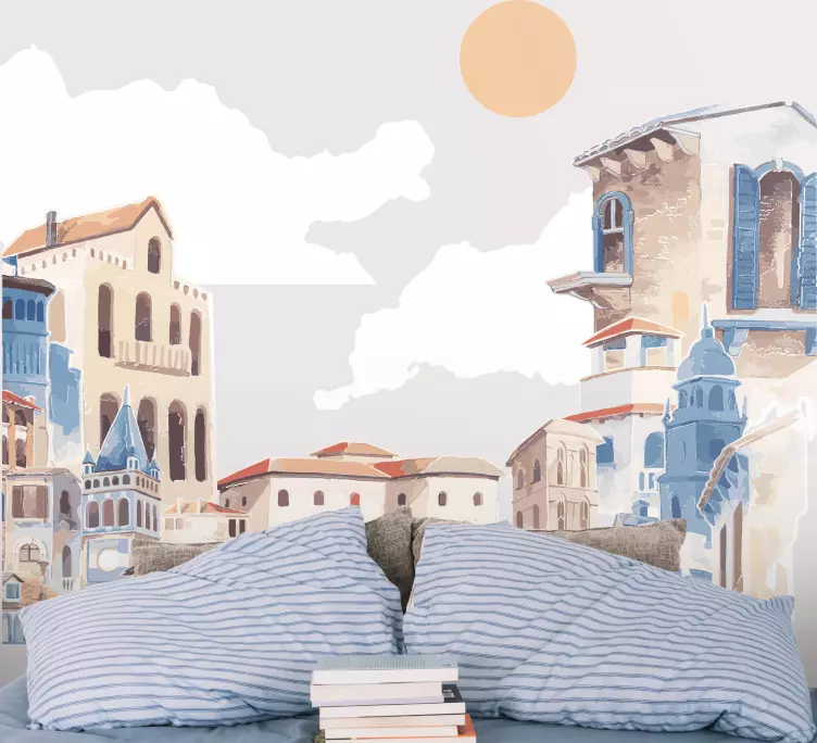 Introducing our stunning Location sticker charming urban landscape, a beautiful depiction of a vibrant town filled with charming village buildings and intricate architecture. This exquisite design captures a breathtaking cityscape painted in watercolor, showcasing warm tones and a radiant sun that brings life to any wall. Perfect for those who appreciate the beauty of urban life!