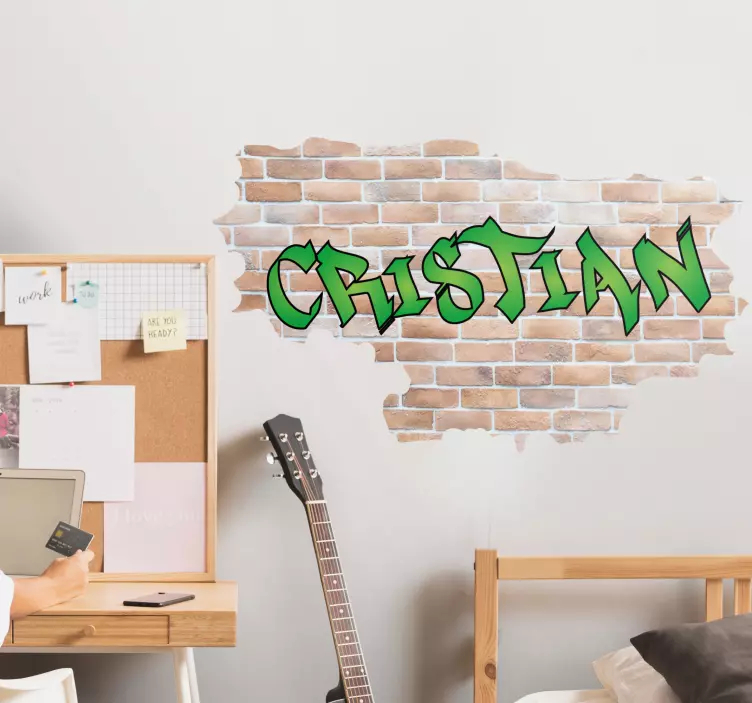 Transform your space with our Location sticker customized urban mural, an eye-catching design that brings the essence of street art into your home or office. This stunning piece features a vibrant graffiti style that decorates a brick wall background, allowing you to personalize it with your own custom name. The combination of green hues and the artistic flair of urban art creates a lively atmosphere that reflects your unique personality and style.