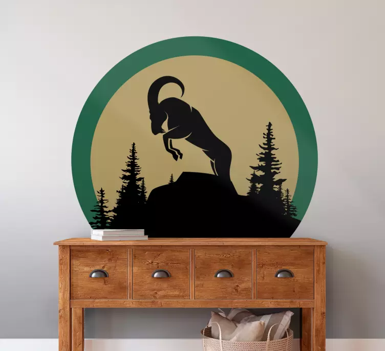 Reference: A48507A striking silhouette of a mountain goat captured mid-leap, surrounded by towering trees set against a softly colored circular background. This design evokes a sense of adventure and the essence of wildlife, perfect for those inspired by nature and the great outdoors.