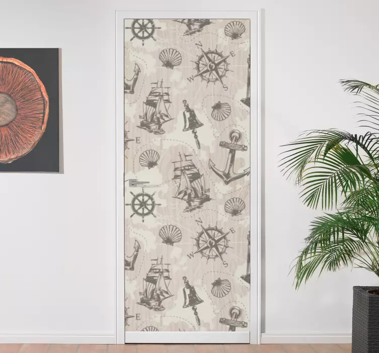 Transform your space with our Nautical adventure theme door sticker, featuring a stunning graphic design that captures the essence of the sea! This eye-catching adhesive showcases intricate illustrations of anchors, wood planks, and nautical elements like compasses, seashells, and lighthouses. Perfect for beach lovers and sailing enthusiasts, this door sticker brings a marine vibe right to your doorstep!