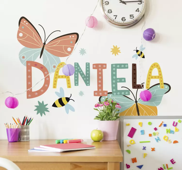 Reference: A51997Playful design featuring vibrant butterflies alongside a customizable name. Ideal for children's rooms, this charming artwork enhances a warm atmosphere while introducing elements of nature and joy. The butterflies embody a sense of freedom, adding whimsy to any space.