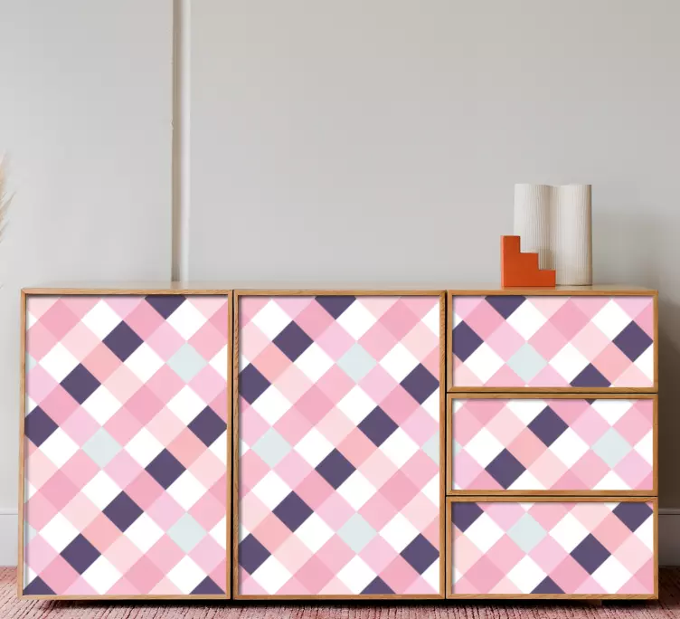 Introducing our stunning Object sticker pink patterned surface, designed with a vibrant checkered pattern that beautifully combines geometric shapes and colorful textures. This modern decor piece adds a playful touch to any furniture or drawer, elevating your home decor with its unique and stylish flair!