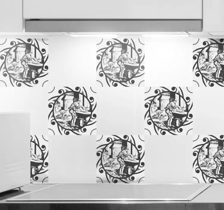 Introducing our stunning Object sticker vintage craft scene, a beautiful blend of artistic expression and abstract design! This unique sticker features a captivating scene that includes elements of baking, a person, tiles, and intricate engravings, all presented in a striking black and white palette. The artistic fusion of these elements creates a visually engaging piece that transforms any space into a craft lover's paradise!