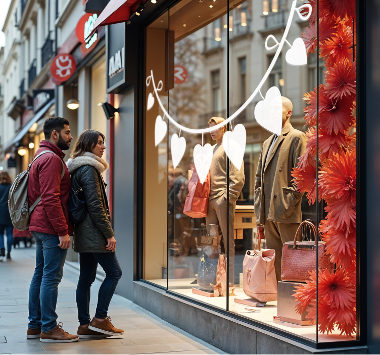 Reference: A40830Introducing our stunning semicircle hearts valentine's sticker, perfect for adding a touch of love to any shop front or shop window this Valentine's season! With a delightful design featuring hanging hearts, this sticker brings warmth and joy, making it an ideal decoration for your Valentine's Day festivities! The vibrant colors and charming graphics will surely captivate your customers and create a romantic atmosphere that everyone will adore!
