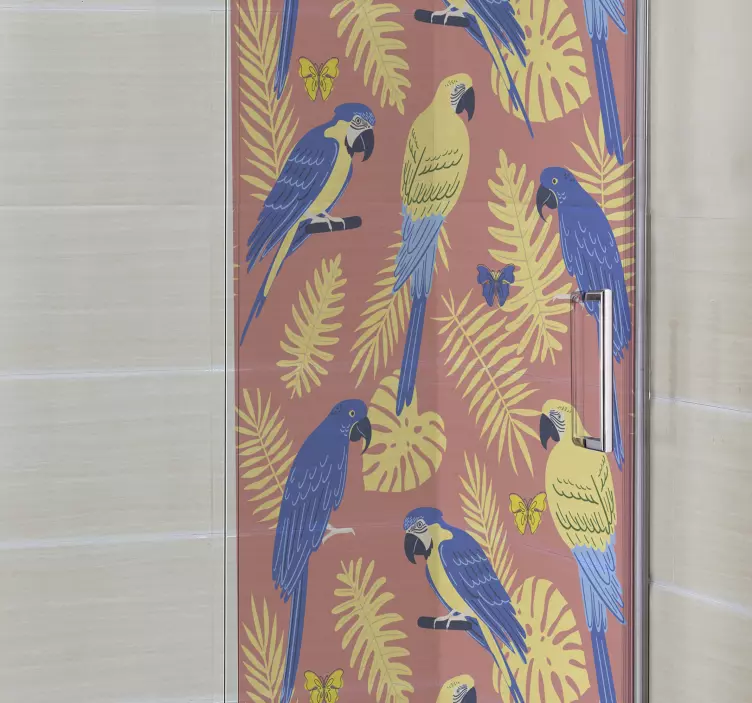 Transform your bathroom into a tropical paradise with our Shower screen sticker colorful parrots design. This stunning design features vibrant macaws perched among lush leaves and fluttering butterflies, creating a lively and inviting atmosphere. The rich yellows and blues of the parrots contrast beautifully with leafy greens, encapsulating the essence of nature in your shower space.