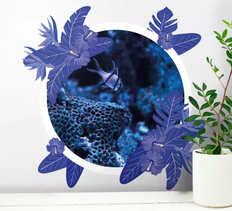 Transform your space into an enchanting underwater oasis with our Wall sticker frame underwater adventure scene. This stunning design features vibrant florals, a captivating round frame, and intricate elements of the ocean such as coral, colorful fish, and lush tropical leaves. The soothing shades of blue and the beauty of nature come together to create a breathtaking visual that will inspire joy and tranquility in any room!