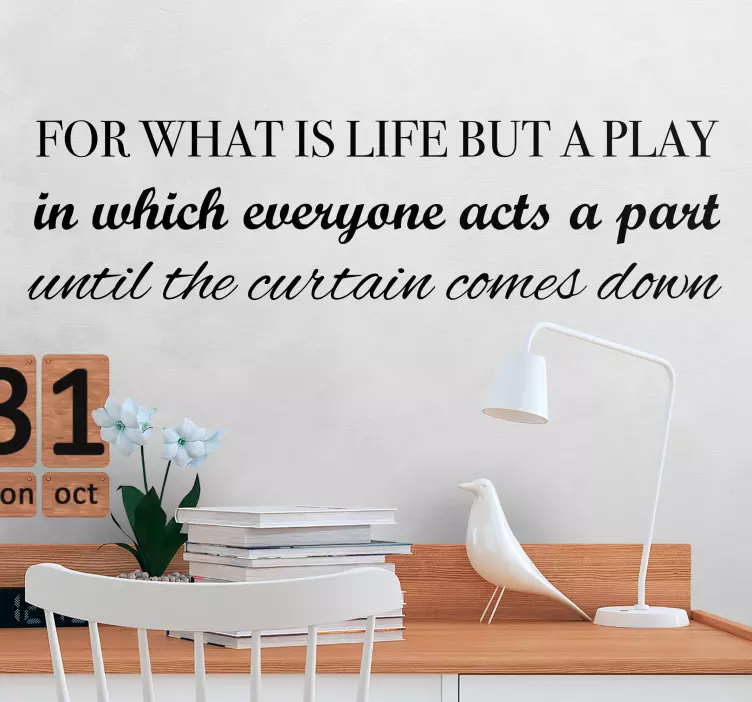 Transform your space with our stunning Wall stickers quotes life is a play quote, designed to inspire and uplift! This beautifully crafted design features a famous quote that encapsulates the essence of life as a theatrical play, blending philosophy and inspiration seamlessly. With its emphasis on the journey of life and the joy of play, this wall sticker serves as a constant reminder to embrace every moment with creativity and passion.