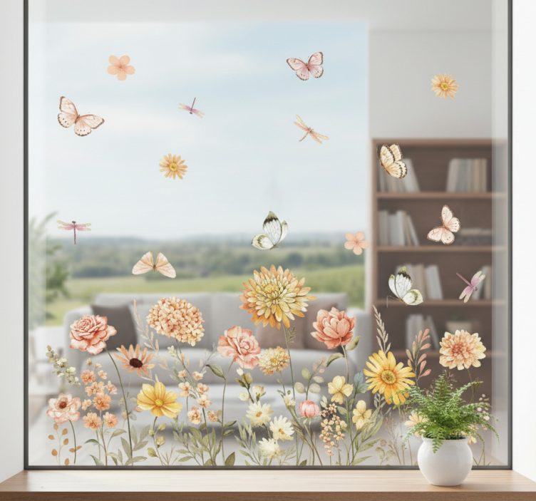 Reference: A53280Transform your space with our stunning Window sticker wildflower meadow with butterflies! This beautifully designed sticker features a vibrant wildflower meadow bursting with colorful blooms and delicate butterflies fluttering about. The satin finish ensures that colors remain rich and vivid without any distracting reflections, making it a perfect addition to any window or flat surface.