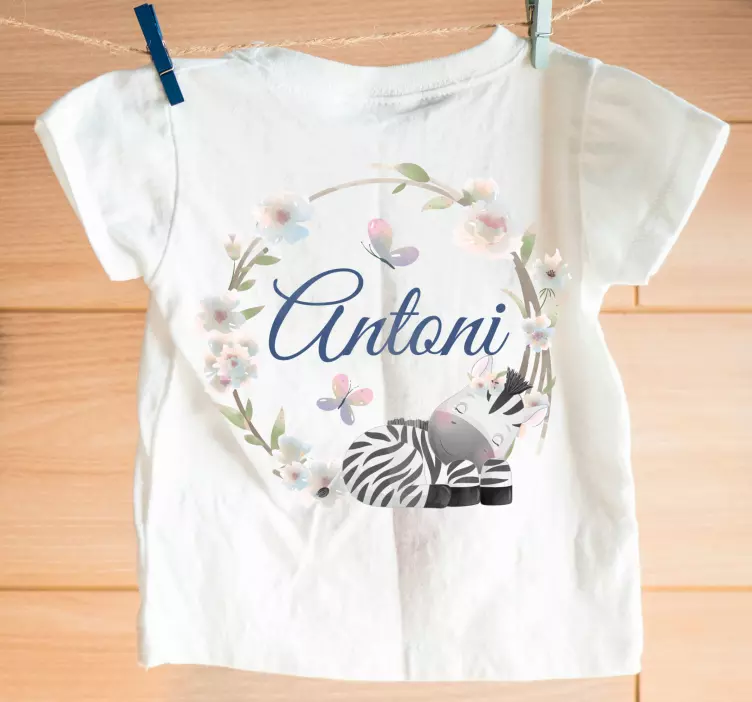 Delight in the whimsical charm of our Baby t-shirt personalized zebra nursery design, featuring an adorable zebra peacefully sleeping amidst a beautiful wreath of flowers. This enchanting design, created with a soft watercolor effect, is perfect for adding a touch of cuteness to your little one's wardrobe. With the option to customize it with your child's name, this t-shirt is not just a piece of clothing but a cherished keepsake!