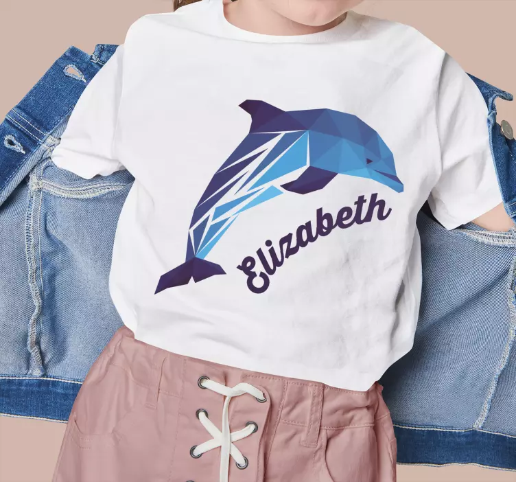 Reference: T4981This vibrant design features a stylized geometric dolphin, symbolizing playfulness and joy. The name centered below adds a personal touch, making it perfect for young children. The cool blue colors enhance the lively appearance, making it suitable for various casual occasions.