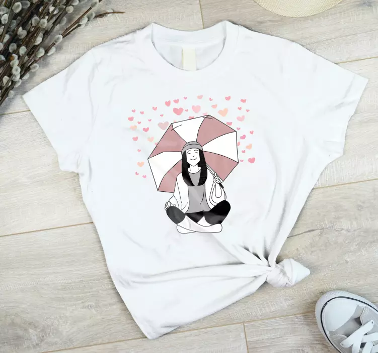 Introducing our Charming heart pattern t-shirt, a delightful piece that brings a touch of joy to your wardrobe! This adorable design features a girl under an umbrella, surrounded by hearts that symbolize love and cheerfulness. The cartoon illustration captures a cute and smiling character braving the rain, making it the perfect casual and comfortable choice for any female looking to uplift her style!