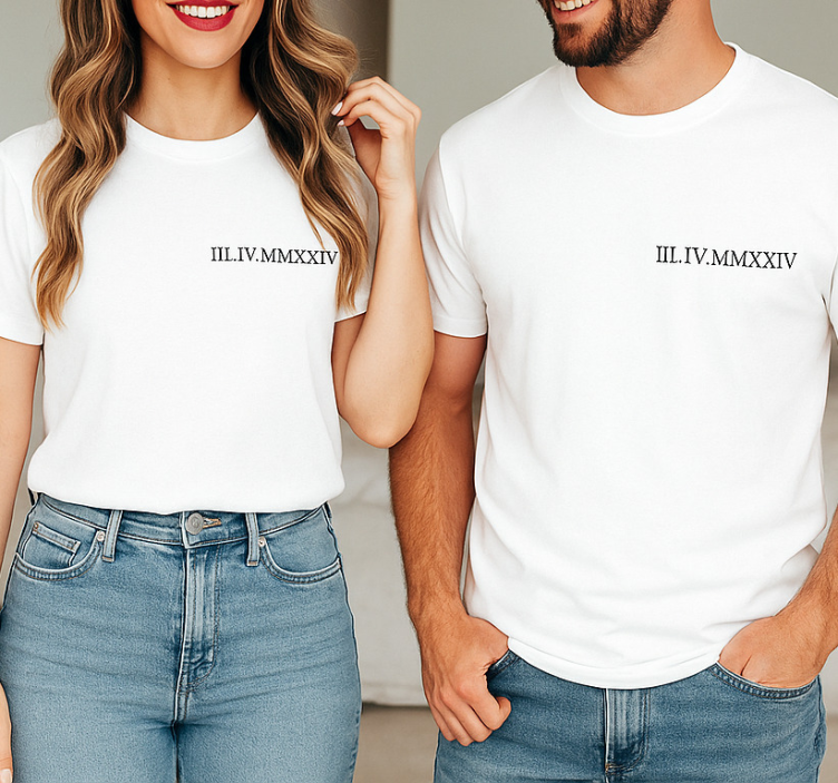 Introducing our stunning Couple t-shirt with matching roman numerals design, a perfect representation of love and togetherness! This beautiful t-shirt features a unique graphic that showcases elegant roman numerals, symbolizing special dates and memories shared between couples. Crafted from 85% cotton and 15% viscose, it promises comfort and style with a round neck and short sleeves. Available in classic black and white, this t-shirt is a great addition to any couple's wardrobe!