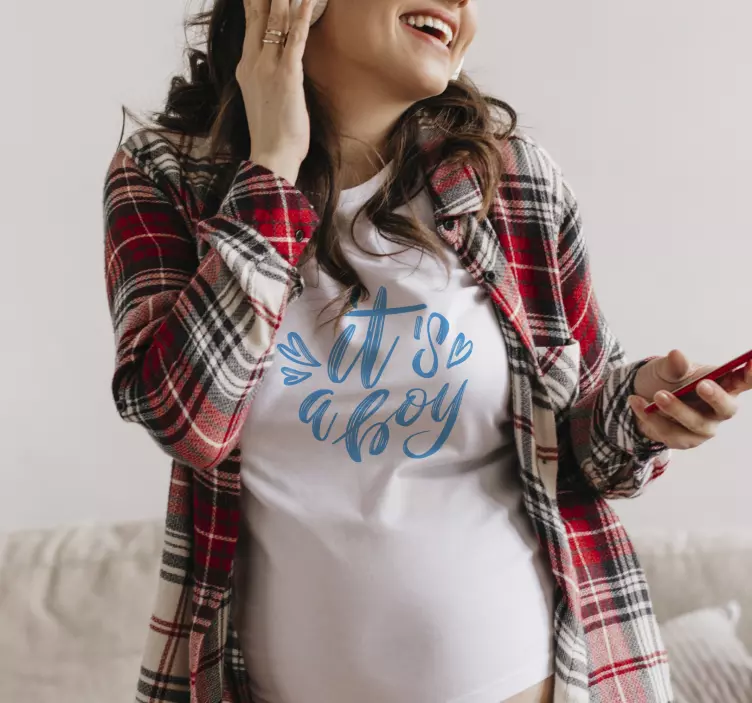 Reference: T4442This image features a joyful mother holding a phone while wearing a special maternity top expressing the excitement of a baby's arrival. The cheerful design highlights the phrase 'It's a boy' in a stylish font, making it perfect for celebrating gender reveals or pregnancy milestones.