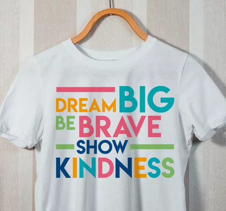 Introducing our Inspire with kindness t-shirt, a vibrant expression of positivity! This multicolor design features an uplifting quote that encourages you to dream big and be brave. The motivational text is beautifully crafted to exude a youthful spirit, making it perfect for anyone looking to spread kindness and inspiration. Its colorful palette is sure to brighten your day and the days of those around you!