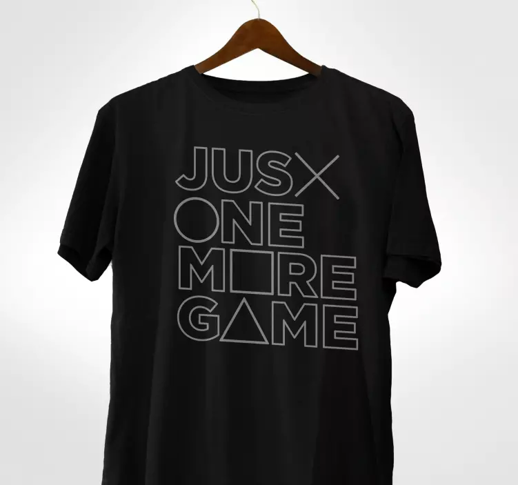 Get this amazing t-shirt design and immerse yourself in the world of gaming with the iconic battle cry of a true gamer: Just one more game! This design features a sleek white lettering aesthetic that perfectly blends the four iconic gaming button geometric shapes into the quote.