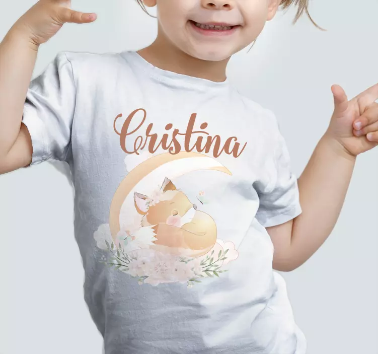 Reference: T4668This adorable design features a sleeping fox, adorned with flowers and a crescent moon. The soft color palette enhances the charm, making it perfect for children. The personalized name adds a unique touch, appealing to parents looking for customized apparel for their little ones.