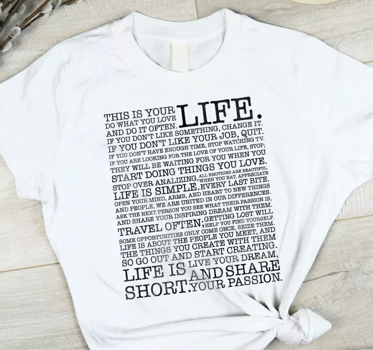 Upgrade your wardrobe with this inspiring t-shirt that is more than just a pretty piece of clothing. The shirt features a paragraph with different quotes about life, each separated by thin lines, reminding you of important life lessons. Made with premium cotton and viscose materials, this t-shirt is designed with your comfort in mind and is easy to clean. You can choose between short or long sleeves to fit your personal style. With immediate shipping, you can enjoy this aesthetic and meaningful addition to your wardrobe today.