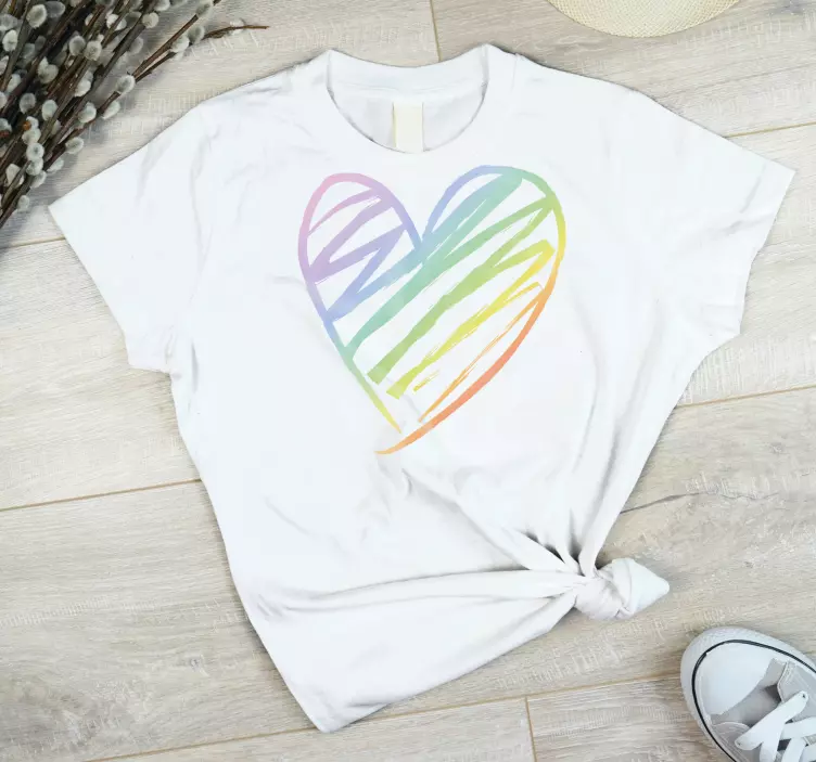 Brighten up your wardrobe with our multicolored heart design t-shirt, featuring a stunning graphic that combines a vibrant rainbow gradient with playful doodles of hearts. This stylish and casual piece is sure to make you stand out, offering a unique blend of colors that radiate joy and positivity. Perfect for any occasion, this t-shirt is not just a garment; it's a statement!