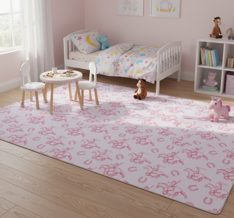 Reference: R20408Transform your space with our stunning Animal vinyl rug with pink cowboy horse design! This vibrant and whimsical design features a charming pink cowboy horse that effortlessly blends fun and elegance. Made with high-quality materials, this rug is not only visually appealing but also designed to enhance your home decor. It boasts features like thermal isolation, scratch resistance, and is anti-slip, ensuring both safety and comfort in any room!