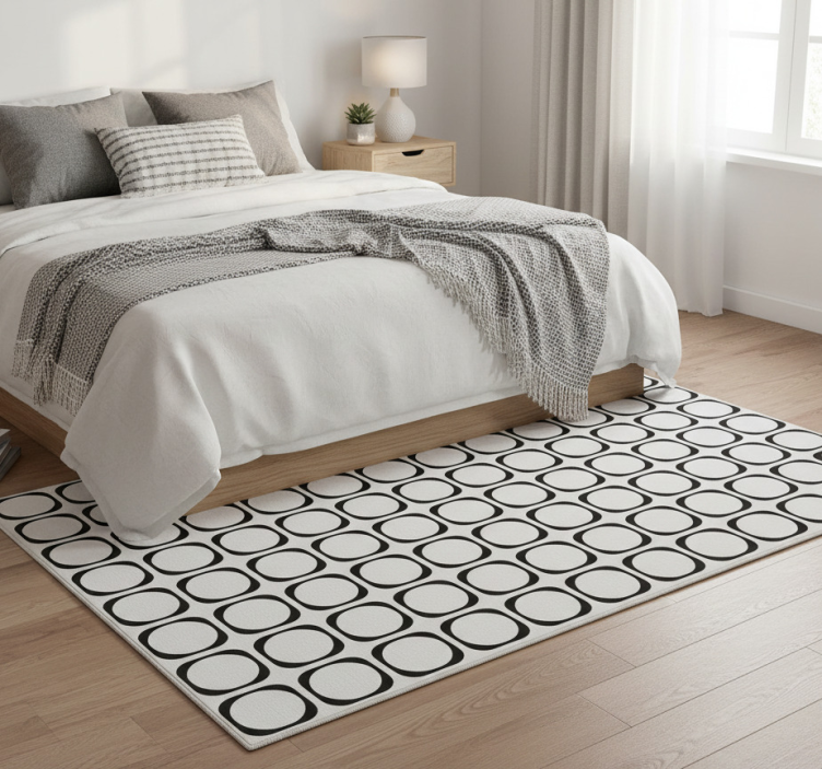 The Bedroom vinyl rug in black and white tiles bedroom vinyl rug is a must-have for those looking to enhance their home decor. Its eye-catching design effortlessly brings a touch of sophistication and style to any bedroom, creating a warm and inviting atmosphere. With its unique blend of colors and patterns, this rug serves as the perfect backdrop for your furniture and accessories, making it an essential addition to your decor.