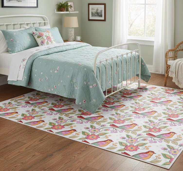 Bedroom vinyl rug with red and orange bird design