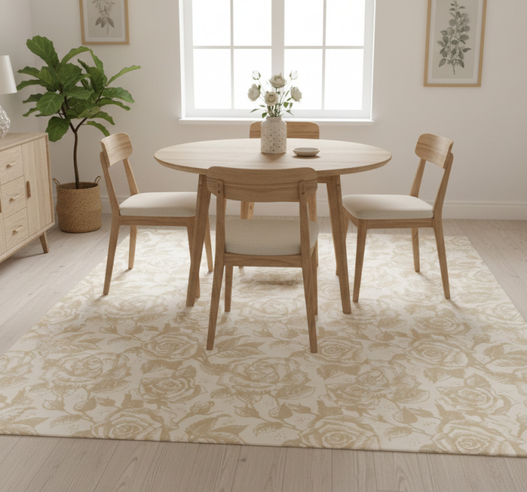 Reference: R21196Transform your dining space with our stunning Beige vintage roses dining room vinyl rug. This exquisite design features beautiful vintage roses set against a soft beige backdrop, creating a harmonious blend of elegance and warmth. Perfectly crafted to enhance the ambiance of your home, this rug brings a touch of timeless charm to any dining room.