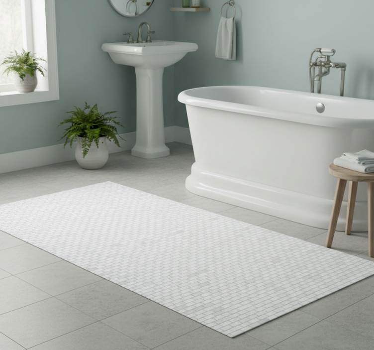 Reference: R23303Transform your bathroom with our stunning Elegant brick pattern bathroom vinyl rug, designed to elevate your space with its sophisticated yet modern aesthetic. This rug features a unique brick pattern that adds a touch of elegance, while also being easy to clean, anti-slip, and scratch resistant. It protects your floor and provides thermal insulation, ensuring comfort and style in one package!