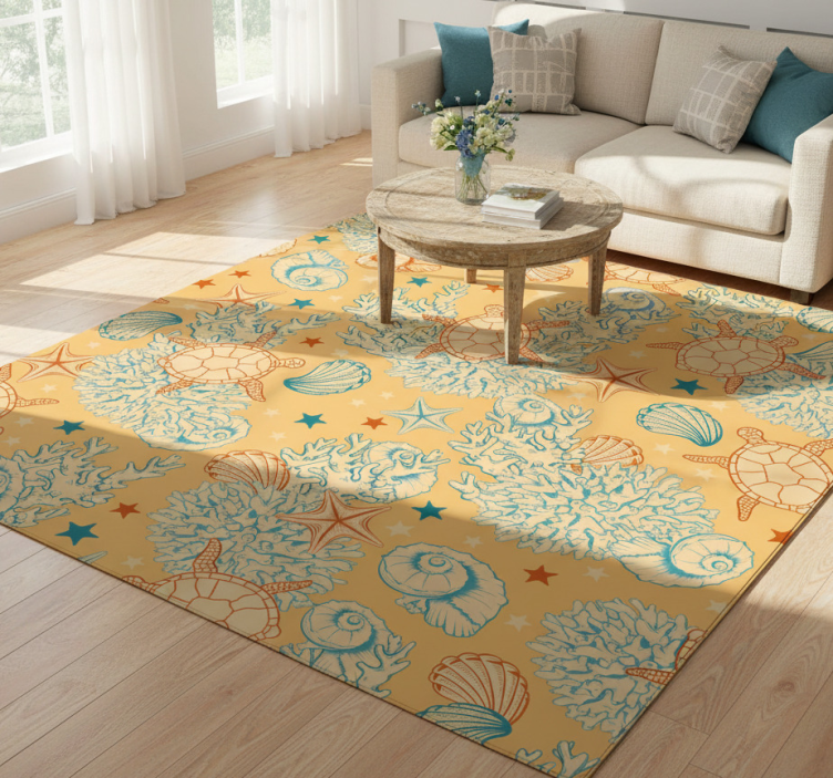 The Flower vinyl rug coral and ocean life is an ideal choice for decoration because it seamlessly blends style and functionality. Infusing your home with a splash of color and a touch of nature, this flower vinyl rug elevates any space, making it not just a rug but a piece of art that speaks to your love for the ocean!