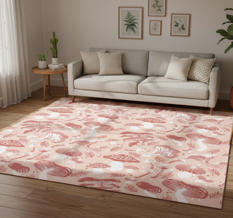Reference: R22050Transform your space with our stunning Flower vinyl rug with forest mushrooms on beige. This exquisite design features whimsical mushrooms nestled among delicate floral patterns, creating a serene and inviting atmosphere in any room. Perfectly balancing elegance and charm, this rug adds a unique touch that harmonizes with various decor styles.