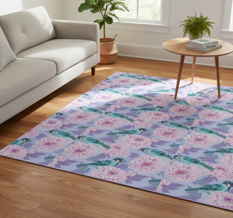 Flower vinyl rug with pink garden flowers and birds