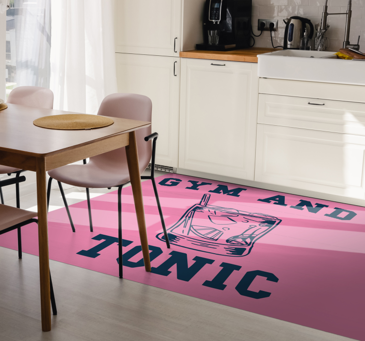 Enhance your home decor with a cute and fresh design that will last for years. Made with premium materials, this vinyl rug is easy to transport and store, and can be used in any room you desire. Featuring a clever wordplay on the gym and tonic theme, this rug is perfect for the kitchen. The pink background and blue gin tonic drink are complemented by the blue text reading 'gym and tonic,' creating a fun and unique design. Order now for immediate shipping!