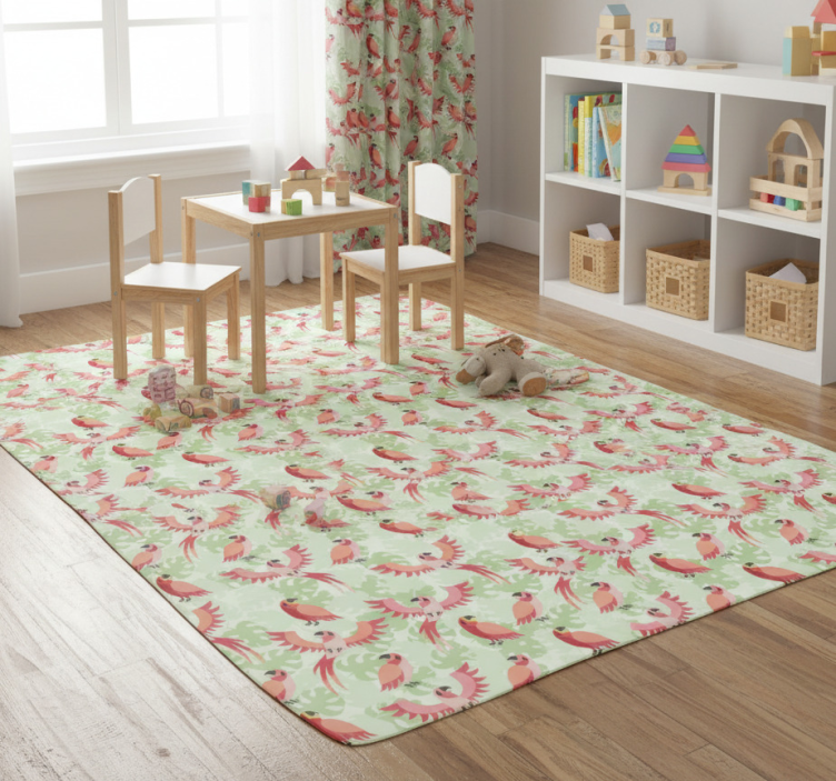 Reference: R20141Step into a vibrant world with our Red birds on green leaves animal vinyl rug. This stunning design features delightful red birds perched on lush green leaves, creating a lively, nature-inspired aesthetic that brings warmth and charm to any space. The combination of bold colors and intricate details makes it a perfect accent for your home, turning any room into a cheerful oasis!