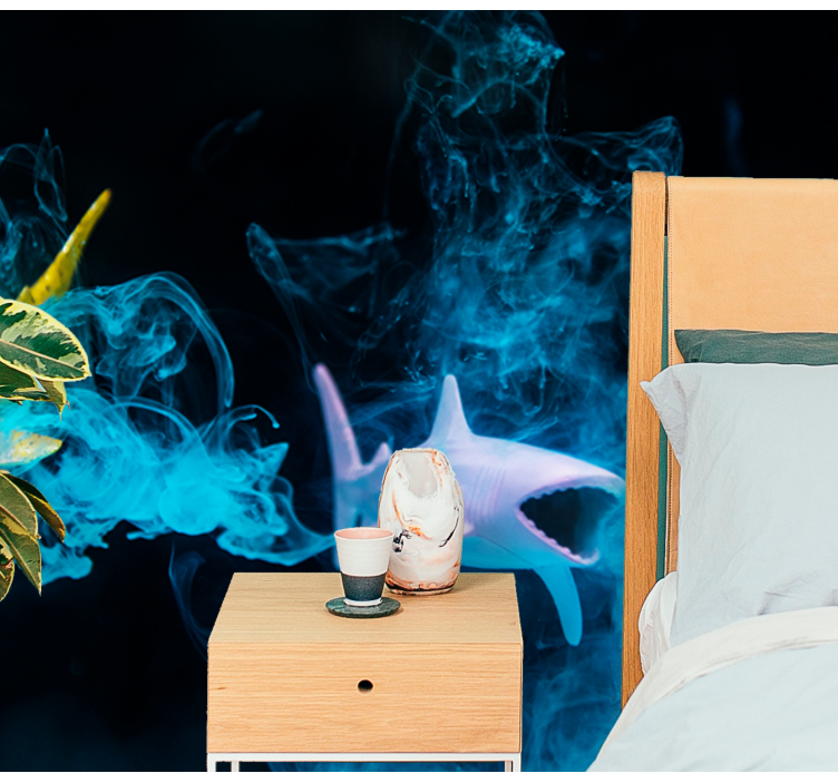 Immerse yourself in the vibrant world of the Animal wall mural colorful shark illustration, showcasing a stunning graphic design that captures the essence of underwater life. This captivating mural features a majestic shark gliding through crystal-clear water, surrounded by ethereal smoke that adds a mystical touch to the scene. With its striking colors and photomontage technique, this mural brings the ocean's beauty and marine life right into your home, creating a breathtaking underwater atmosphere.