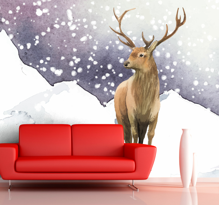 Transform your living space with our stunning Animal wall mural majestic deer scene. This exquisite design features a magnificent stag nestled among snow-capped mountains, bringing the essence of winter wildlife right into your home. The enchanting watercolour painting captures the serene beauty of nature, making it a perfect focal point for any room.