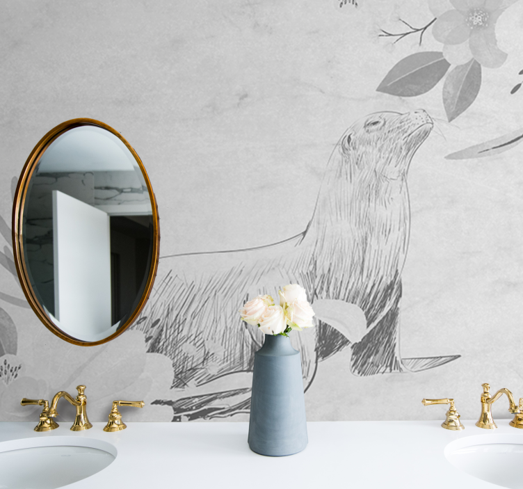 Transform your space with our stunning Bathroom mural seal surrounded by flowers, a captivating design that features a beautifully rendered seal surrounded by delicate flowers in a charming grayscale sketch. This unique artwork brings a touch of nature indoors, combining animal life and floral elements to create a serene atmosphere that enhances your bathroom decor.