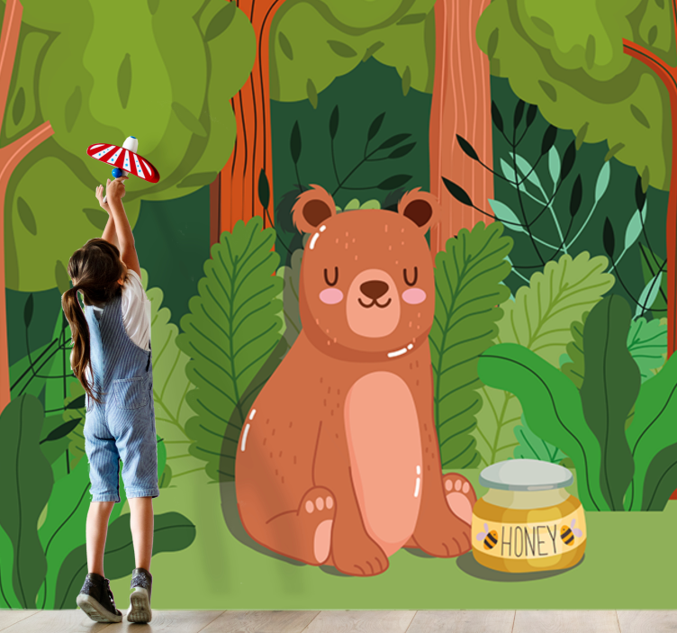Transform your child's space with our enchanting Children wall mural adorable bear art! This delightful design features a charming bear amidst a lush forest, surrounded by playful animals and dripping honey. The illustration captures the beauty of nature, creating a whimsical atmosphere that sparks imagination and joy.