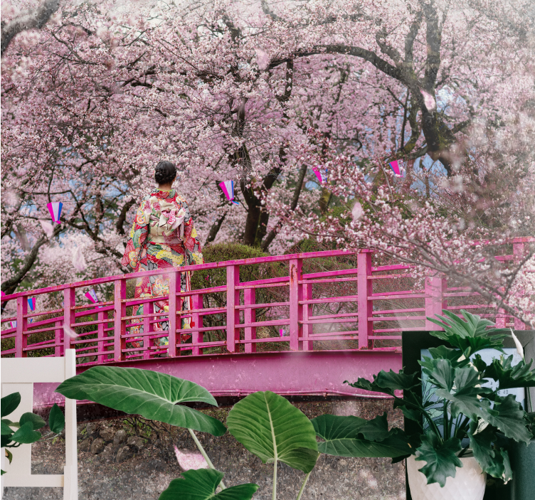 Reference: F12031A serene depiction of cherry blossoms in full bloom, framing a traditional figure on a pink bridge. The delicate pink flowers create a tranquil atmosphere, enhanced by the colorful decorations around, embodying the beauty of nature and culture.