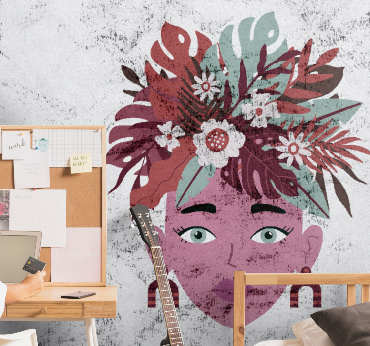 Introducing our stunning People painting mural stylized floral head, a captivating graphic design that beautifully blends the essence of a woman's face adorned with vibrant tropical flowers, lush leaves, and intricate textures. This portrait mural is not just a decoration; it's a statement piece that breathes life into any space!