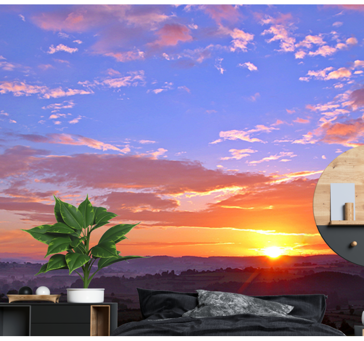 Transform your space with our stunning Sunset over hills landscape mural wallpaper, where the beauty of nature comes alive! This exquisite design captures the breathtaking hues of a sunset sky, complemented by soft clouds that drift above majestic mountains. The horizon stretches across a picturesque landscape filled with rolling hills, making it a perfect addition to any room that craves a touch of the great outdoors. Immerse yourself in this captivating photography that brings warmth and tranquility to your home.