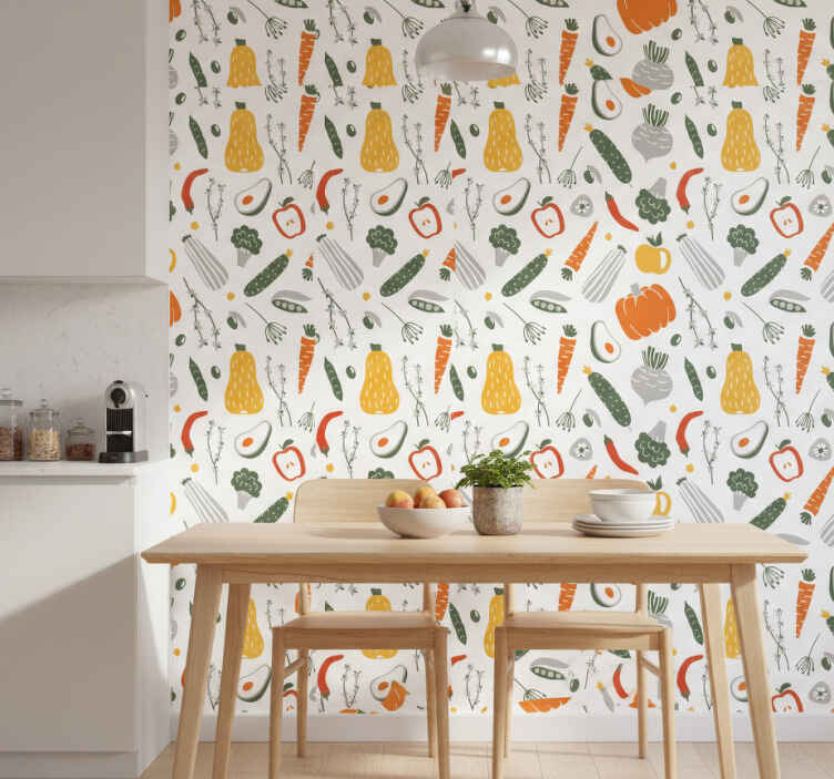 The Kitchen wallpaper colorful vegetable collection kitchen wallpaper is an ideal choice for those looking to enhance their kitchen's ambiance. Imagine a space where the beauty of fresh vegetables is reflected on your walls, inviting warmth and creativity into your cooking area. This design isn't just about aesthetics; it's about creating a joyful environment that inspires culinary adventures and family gatherings! Make every meal a celebration with this lively wallpaper that brings a touch of the garden indoors.